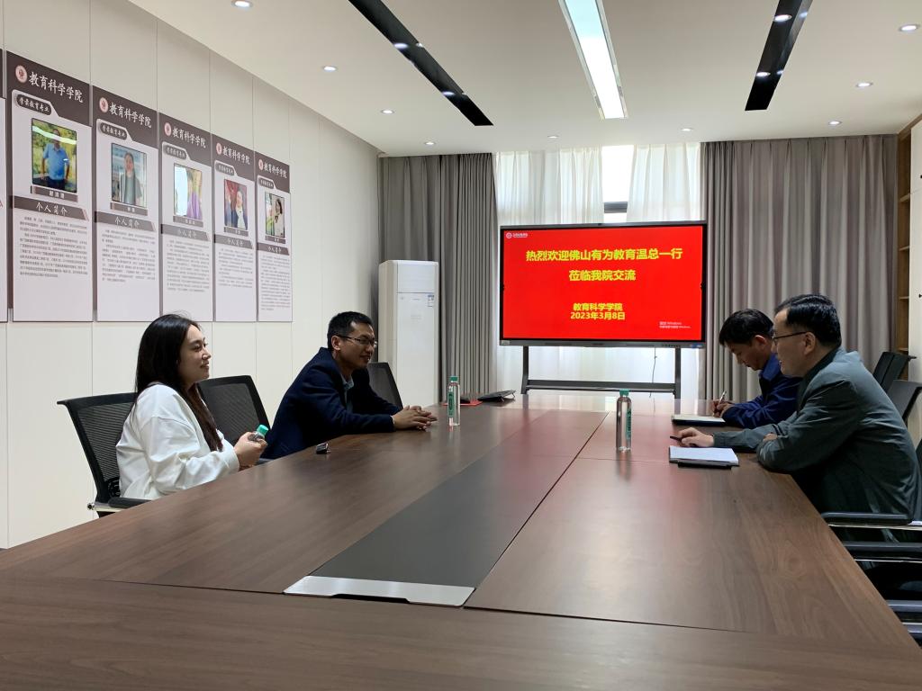 3月8日上午,佛山市有为教育一行到我院洽谈校企合作。校企双方在我院明德楼408会议室举行会谈,佛山市有为教育负责人温才坚,我院党委书记崔海波、副院长程传利参加此次会议,会议由该院党委书记崔海波主持。