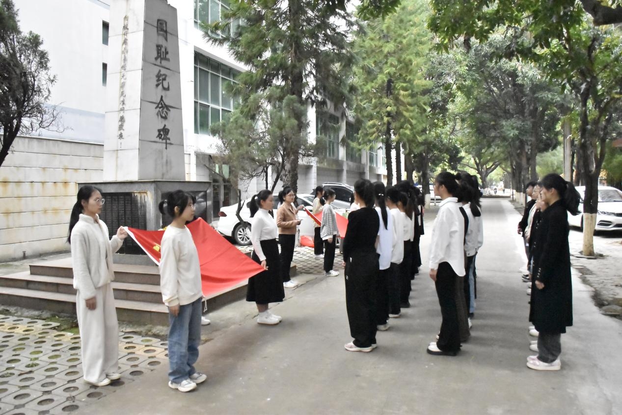 活动伊始,全体人员庄严地站在国耻纪念碑前,奏唱国歌。随后,党员周卫清从纪念碑的历史背景、复建原由、设计图案的深刻寓意三个方面进行解说,她呼吁同学们无论身在何时、何地,都要有一颗强烈的爱国心,要珍惜生活,铭记历史,报效祖国。讲解完毕,全体人员默哀一分钟,并向革命先烈和遇难同胞敬献鲜花。农小献带领全体党员重温入党誓词、团员重温入团誓词。最后,农小献希望学生们能不忘来时路,吾辈当自强。现在和平生活来之不易,应始终铭记美好生活的今天是革命先烈用鲜血换来的,同时也不能忘记落后就要挨打的惨痛教训。她要求,作为新时代青年大学生的我们应将革命先烈的精神内化于心,严格要求自己,牢记职责使命,为实现第二个百年奋斗目标和新时代中华民族的伟大复兴而不懈努力。