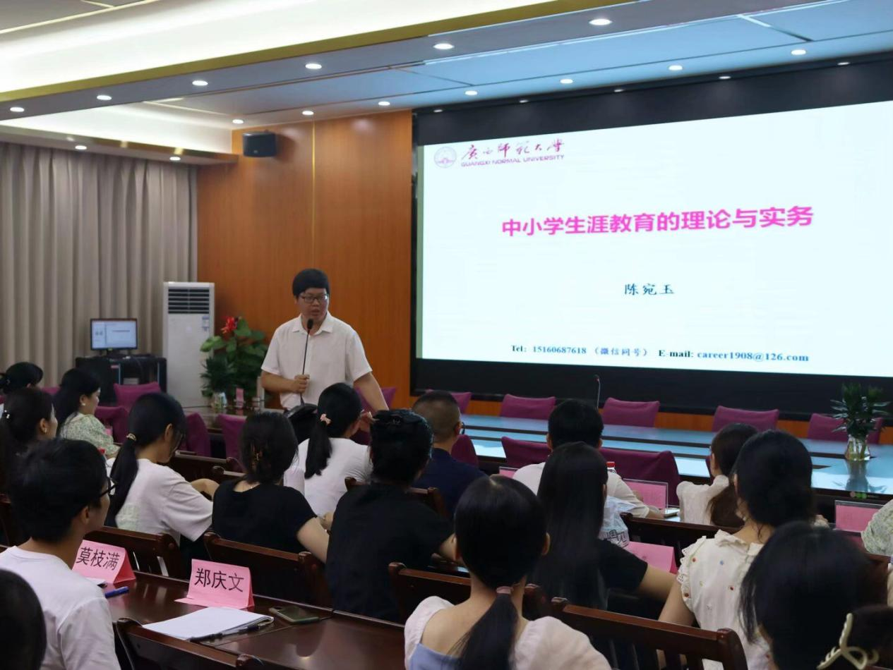 9月20日晚上,陈宛玉在东校区明德楼学院会议室为我院应用心理学专业学生和玉林市第一中学李昌凤工作坊坊员讲授“中小学生涯教育的理论与实务”专题讲座。在讲座中,陈宛玉围绕“生涯教育的概念及途径、中小学生涯教育的理论及实践应用、中小学生涯规划指导的内容及实施”展开。他就生涯教育相关概念进行详细解释,指出生涯规划具有时空性、差异性、互动性等特性,需结合学生个性特点、实际情况等重要内容制定适合学生生涯教育方案。其次,他表示教育途径需结合当下实际情况进行,并围绕管理层面、载体层面、支持层面展开讲解,详细介绍各个层面具体内容及重点知识,提醒在场学生加强对政府政策、学校任务、协会交流、必修课程及赛事、家校支持工作等内容的关注。最后,他结合心理学相关理论进行中小学生涯教育的理论及应用启示讲述,表示学生在信息加工生涯中通过自我知识、职业知识提高自我生涯决策意识,从而加强自我元认知理念和执行力,并耐心解答在场学生所提出疑问。