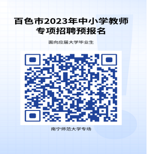 2023年11月23日18:00至12月1日18:00前,有意向参加南宁师范大学专场的应聘人员可通过网络进行预报名,使用QQ或微信扫描《百色市2023年秋季面向应届大学毕业生招聘中小学教师公告》中的二维码,如实填写个人相关信息,并提交报名表。每个专场应聘人员只能填报一个岗位;在广西师范大学专场完成招聘的岗位,南宁师范大学专场不再安排现场报名和招聘。