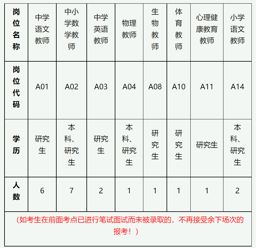 由于我们已在辽宁师范大学、哈尔滨师范大学开展了现场招聘,各考点招聘岗位和人数随招聘进程动态调整,最终考点的岗位及需求人数,以现场为准。最新招聘岗位信息,我们将会在计划前往的高校相关就业公众号发出,请密切关注或致电高新区教育局人事股0758-3103815查询。